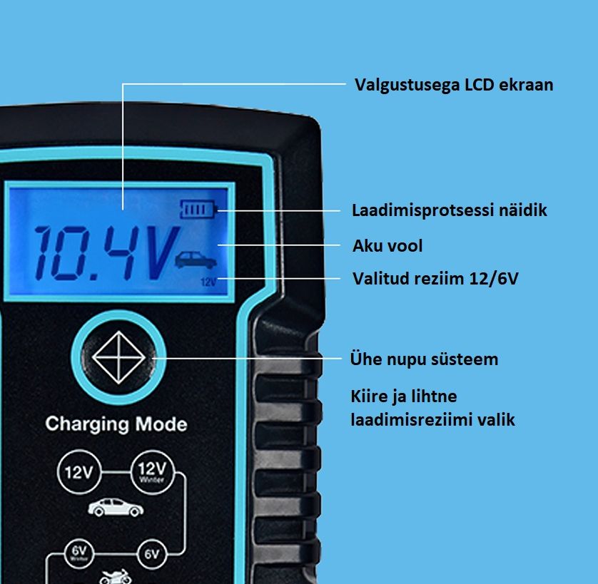 - Suur LCDekraan mis näitab pinget V ja laadimist