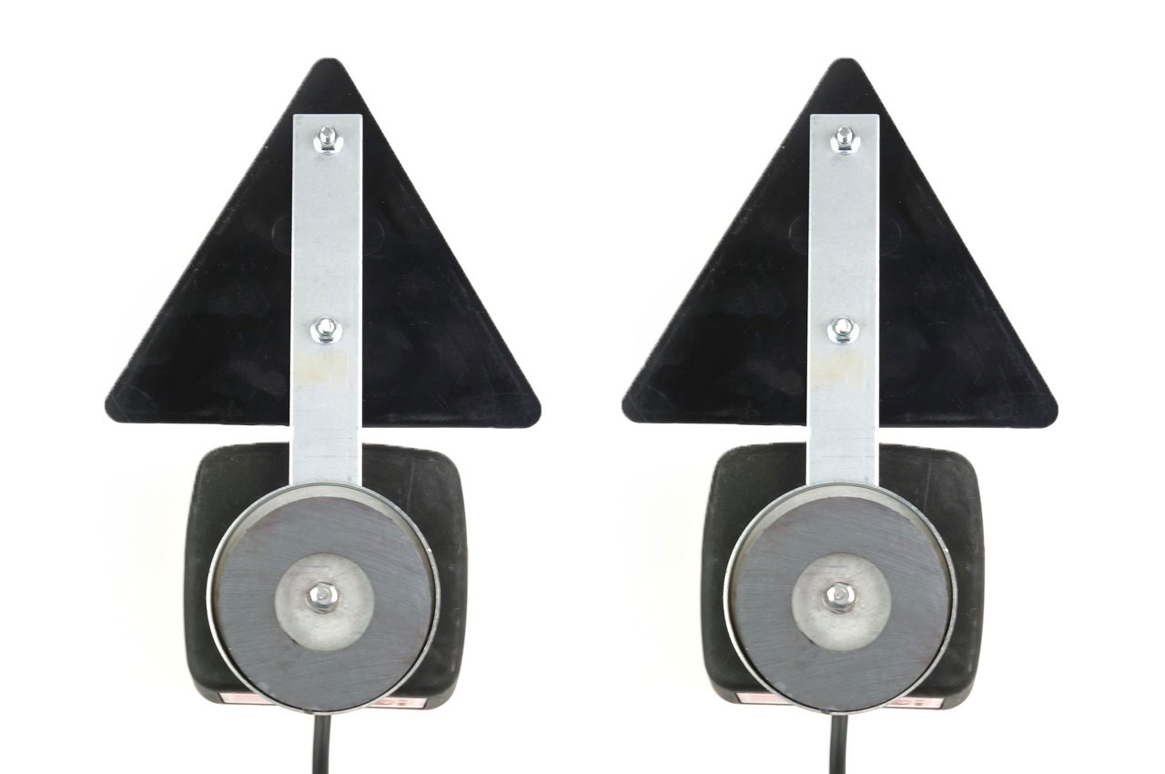 Kolmnurksete helkuritega lampide komplekt, mis on varustatud tugevate magnetitega lihtsaks paigaldamiseks ja eemaldamiseks. Pirnid komplektis.