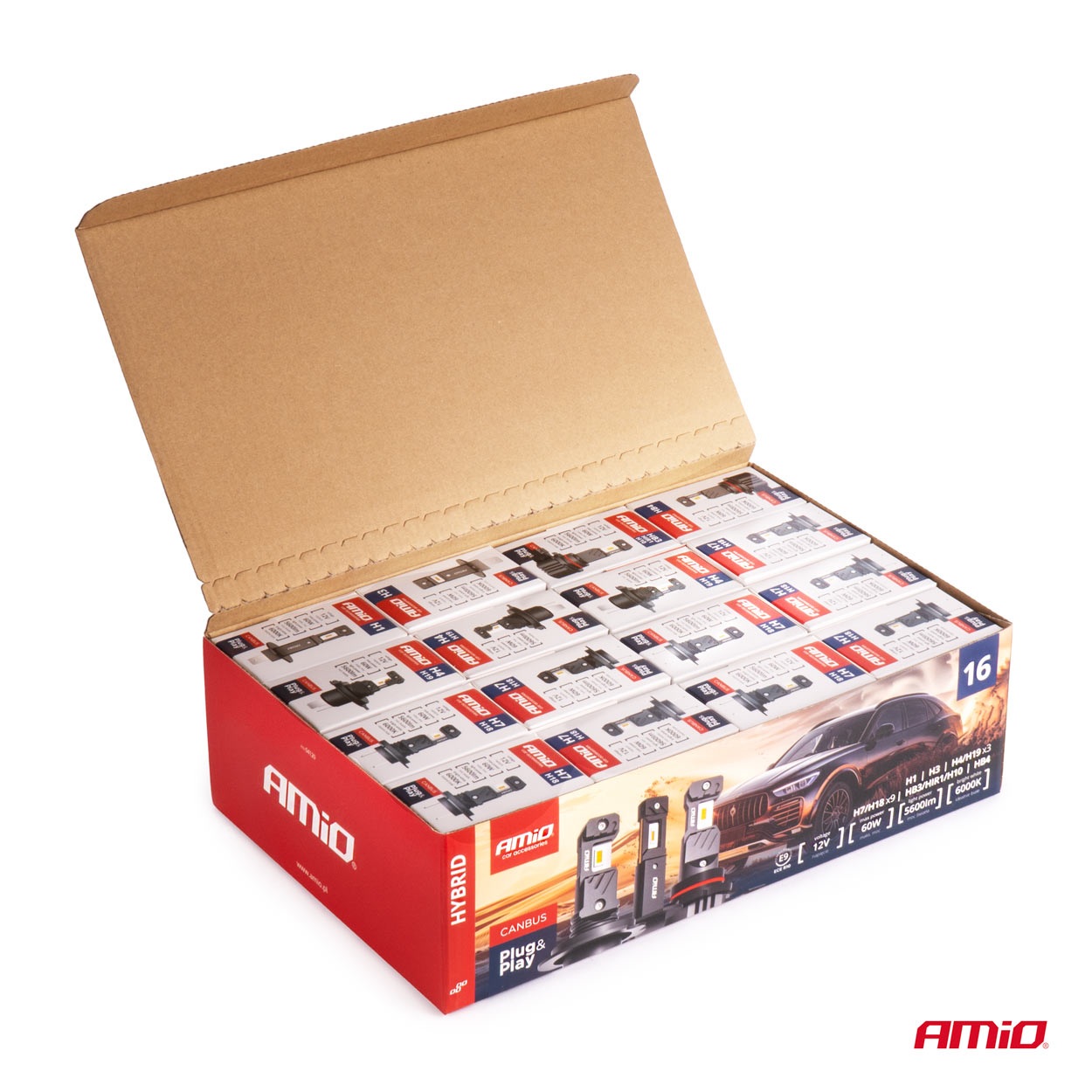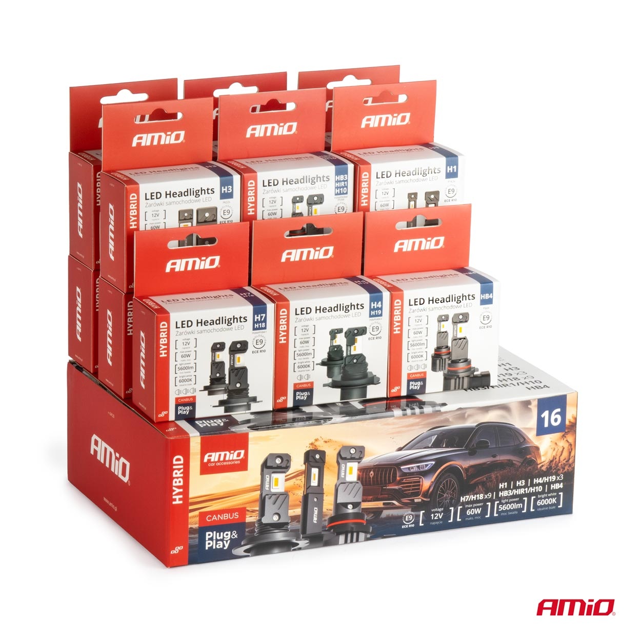 LED esituled hübriidseeria H1 H3 H4 H7 HB3 HB4 6000K Canbus 16 komplekti Amio 04120