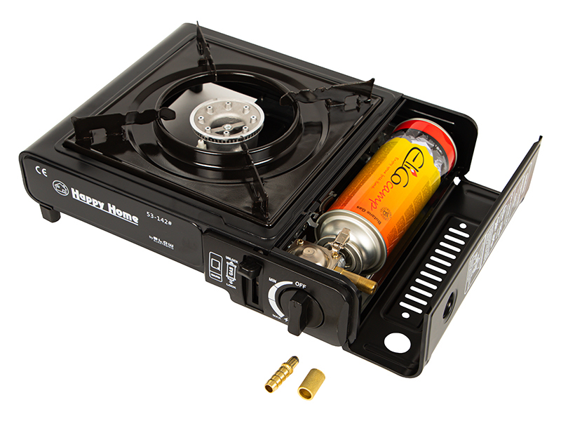 2200W gaasipliit. Toiteallikaks on standardsed TS-700 gaasipadrunid või gaasiballoon (adapter on kaasas). Saate kasseti hõlpsasti ühendada ja seejärel uuega asendada, kui see on otsas. Pliidil on sisseehitatud automaatne piesoelektriline süütaja, selle süütamiseks pole vaja tikke ega tulemasinat. Lisaks on sellel leegi reguleerimise nupp ja gaasivoolu reguleerimisega liugur.