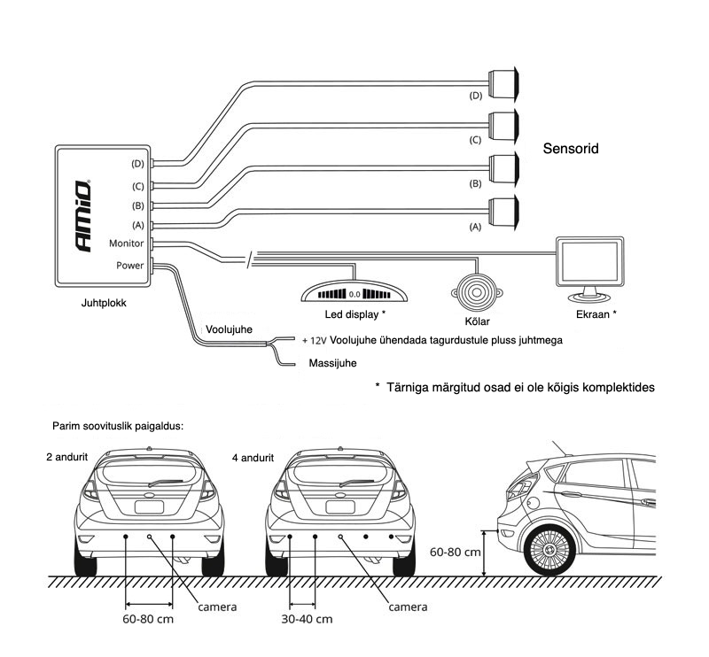 PAIGALDUS: Seadme paigaldust tohib teha vaid professionaalne autoelektrik. Kõik ühendused tuleb isoleerida või muul viisil vältida niiskuse sattumine ühendustesse. Andurid tuleb paigaldada vähemalt 50 cm maapinnast ja vahe andurite vahel mitte enam, kui 70 cm. Enne paigaldust veenduda, et antud kohas oleks andurile piisavalt ruumi. Ava diameeter 22,5 mm. Peaprotsessor paigaldada auto pakiruumi. Toitejuhtmed ühendada järgnevalt: must juhe- auto mass ( miinus ), punane juhe- tagurdustule plussjuhe. Paigalda digitabloo auto armatuurile juhi vaatevälja. Andurid paigaldada auto tagapamprile, andurid ühendada juhtblokki alustades anduriga mis asetseb pamperi vasakus servas pesadesse a, b, c ja d ning displei pesasse millele on kirjutatud DISPLAY.