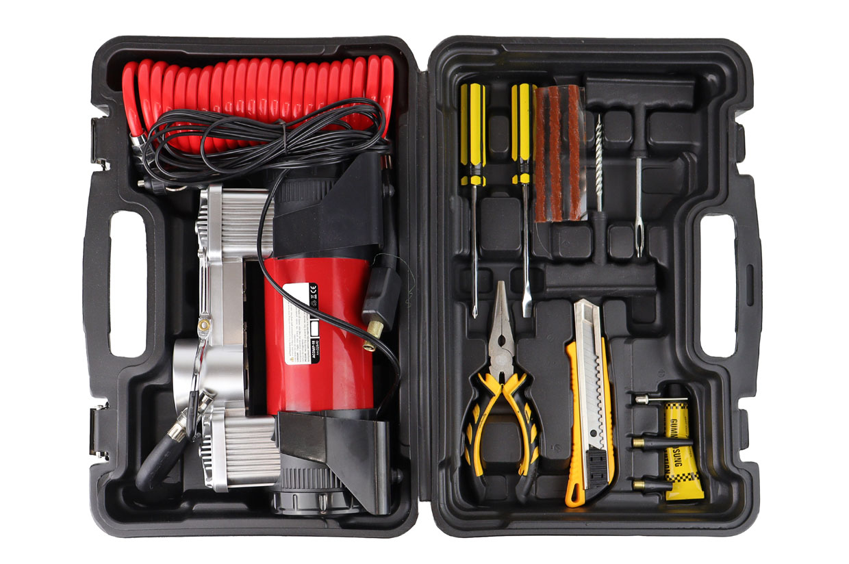 Rehvikompressor 2-sil kohvris+ tööriistad Amio 02640